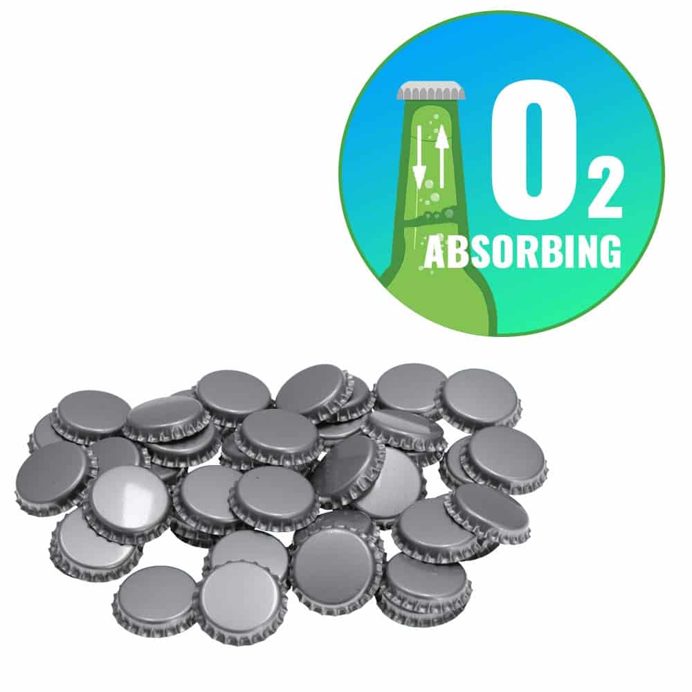 O2 absorbing crown caps, equipped with a special liner, which absorbs the oxygen that is in the bottle neck after bottling.