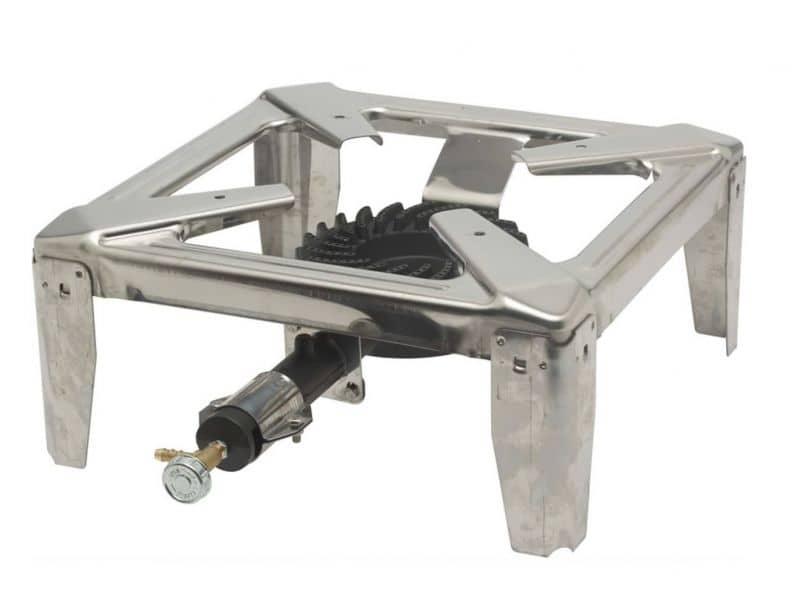 Large stainless steel gas burner with cast iron gas spout and regulating tap.