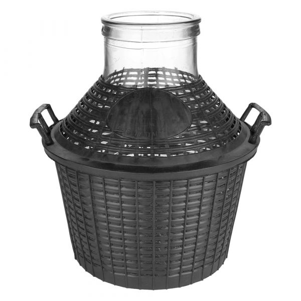 - Glass bottle with wide opening of 115 mm inside diameter. with plastic basket.