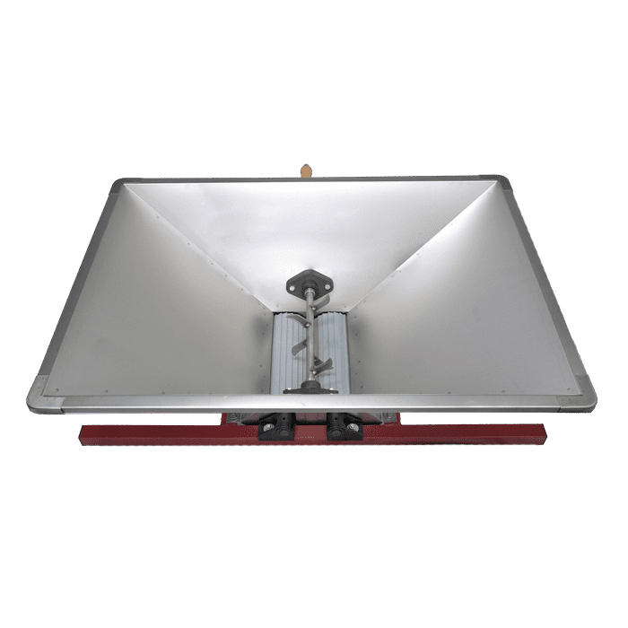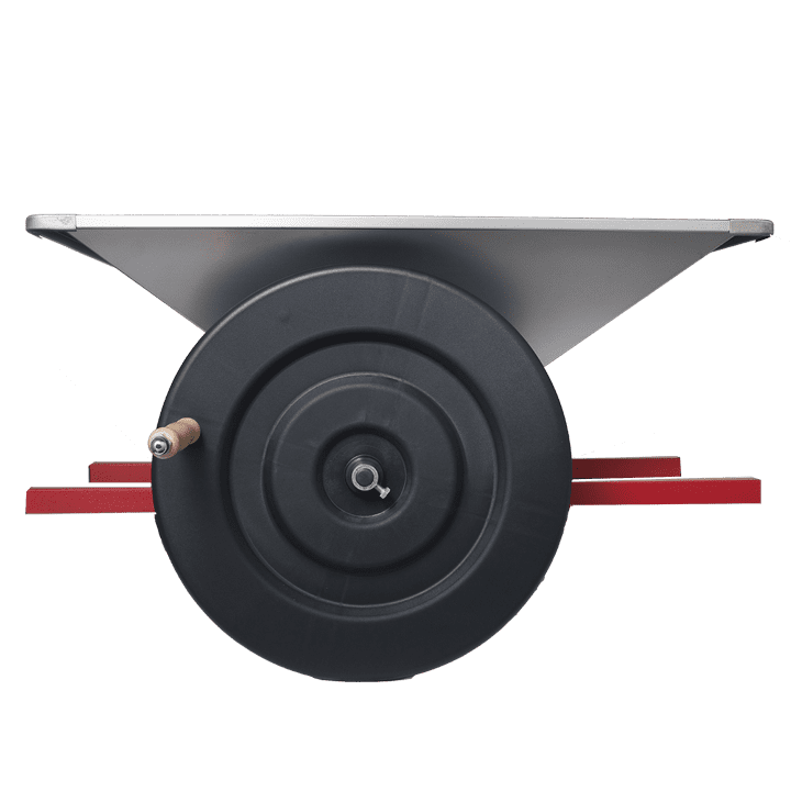 Handbetriebene Obstmühle zum Zerkleinern und Verarbeiten von kernlosem Obst, ideal für Äpfel. Hergestellt mit einem Trichter aus rostfreiem Stahl und einem emaillierten Stahlrahmen. Ein Schwungrad ermöglicht den manuellen Betrieb, die lebensmittelechten Nylonrollen mit Edelstahlzähnen sind um wenige Millimeter verstellbar.