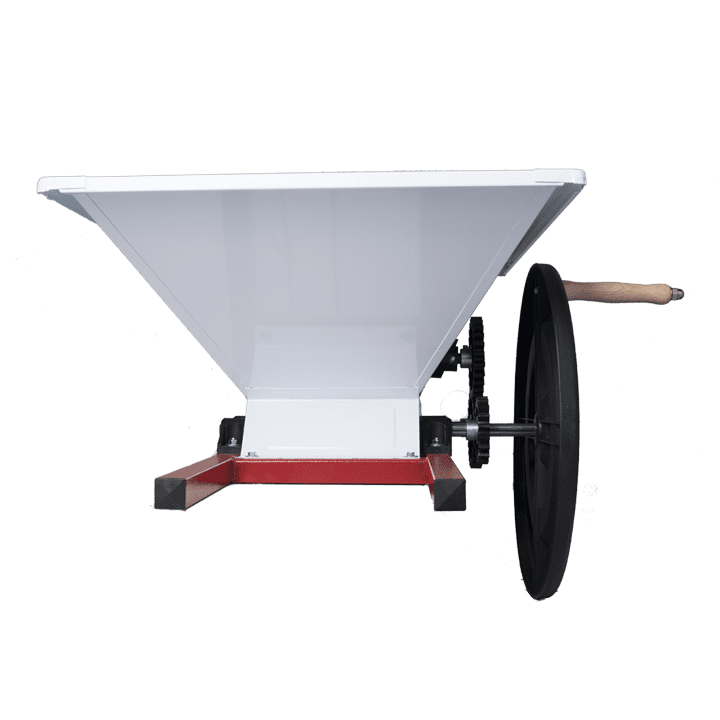 Handebetriebene Traubenmühle zur Herstellung von Traubenmost, ideal für alle, die schnell eine große Menge Trauben verarbeiten wollen. Trichter, Rahmen und Mischer sind aus lackiertem Stahl. Die Rollen und Zahnräder sind aus Nylon gefertigt, um eine lange Lebensdauer zu gewährleisten und eine Verunreinigung der Lebensmittel zu verhindern. Mit speziellen Halterungen können die Rollen bis zu einigen Millimetern verstellt werden.
