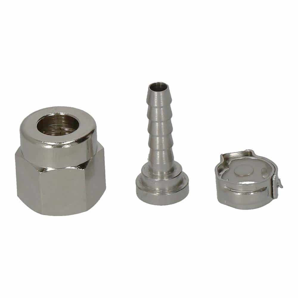 Edelstahl-Schlauchtülle 4 mm mit Überwurfmutter (7/6" UNF-Gewinde). Passend für Sodakegs (NC oder CC) mit 7/6" UNF-Gewinde.