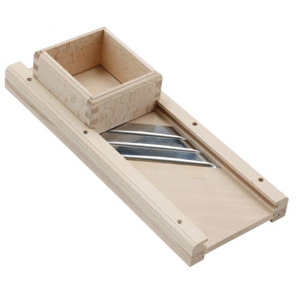 Zuurkoolschaaf/Groenterasp in beukenhout met 3 RVS messen om snel kool en groenten te verwerken.